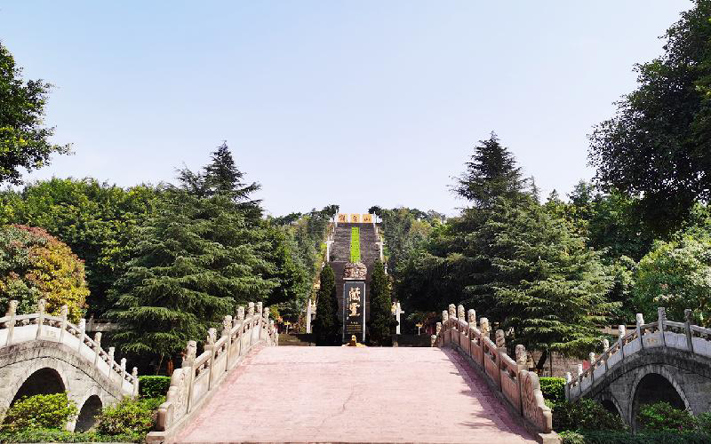 神道为陵园中轴线上重要构筑,亦是连接山门、广场到山顶的主要通道。长150米,宽15米,按古代“数论”的大阳之数设计,整体分为9段共367步,365步代表人生阳寿的365天,剩下2步代表超越人生的2天。另外7也代表“胜造七级浮屠”。神道上建有三道天门,分别是一天门、中天门、西天门,这是取自泰山,泰山是“五岳独尊”、“天下第一山”,能给予陵园墓区最大的安慰。